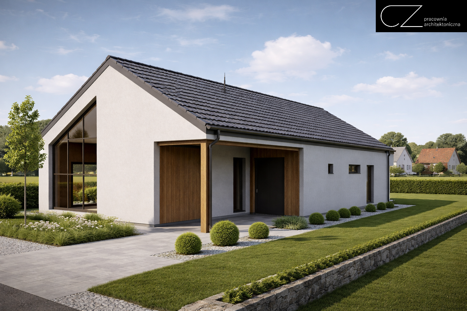 Forma budynku nawiązuje do charakteru wiejskiej zabudowy, jednocześnie zachowując elegancki, uporządkowany wygląd. Szary dach, starannie dobrane opaski wokół okien i dopracowane proporcje bryły budują spójną całość, która dobrze wpisuje się w otoczenie. Efektem jest spokojny, bardzo estetyczny dom, zaprojektowany z myślą o codziennym komforcie i długofalowym użytkowaniu.