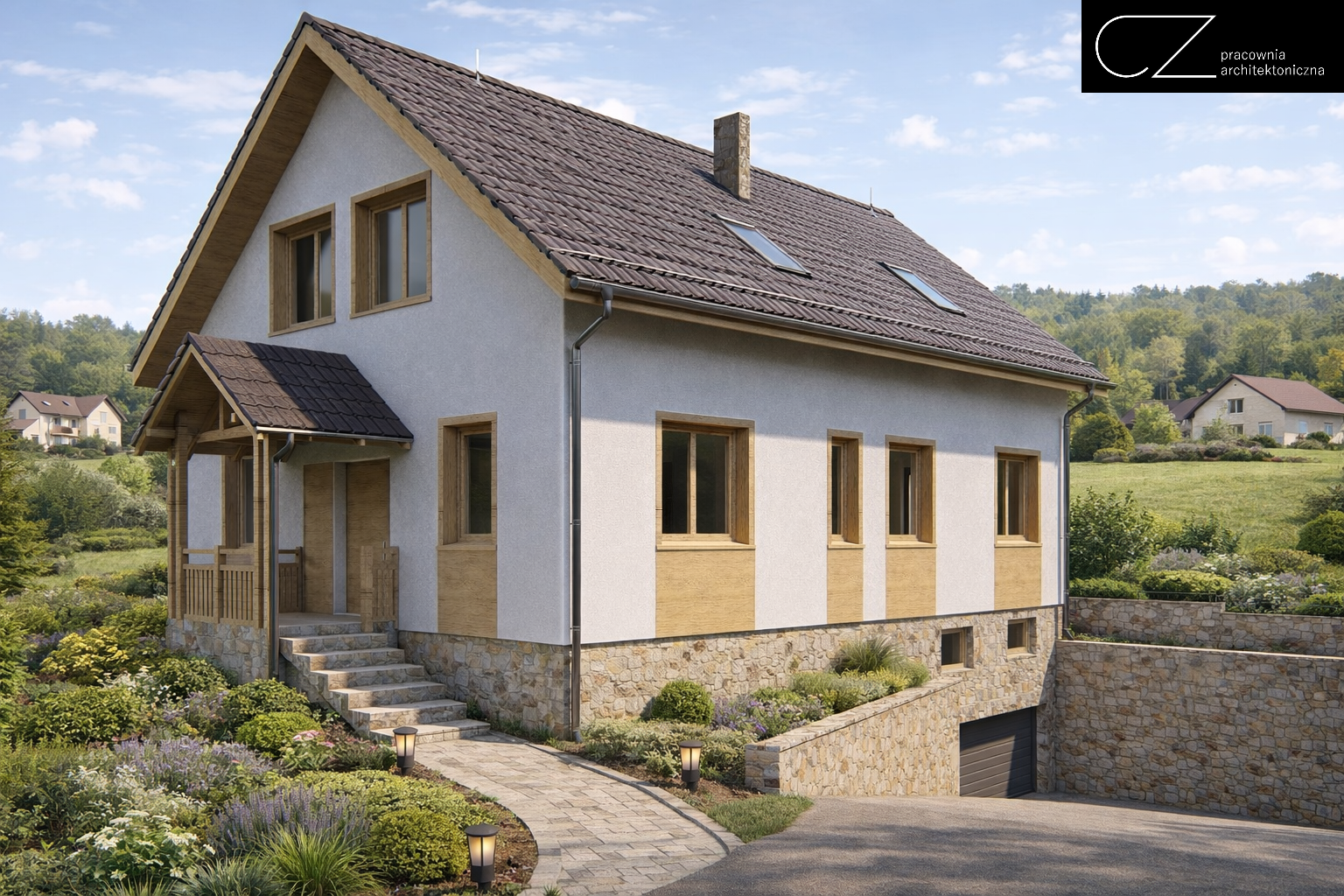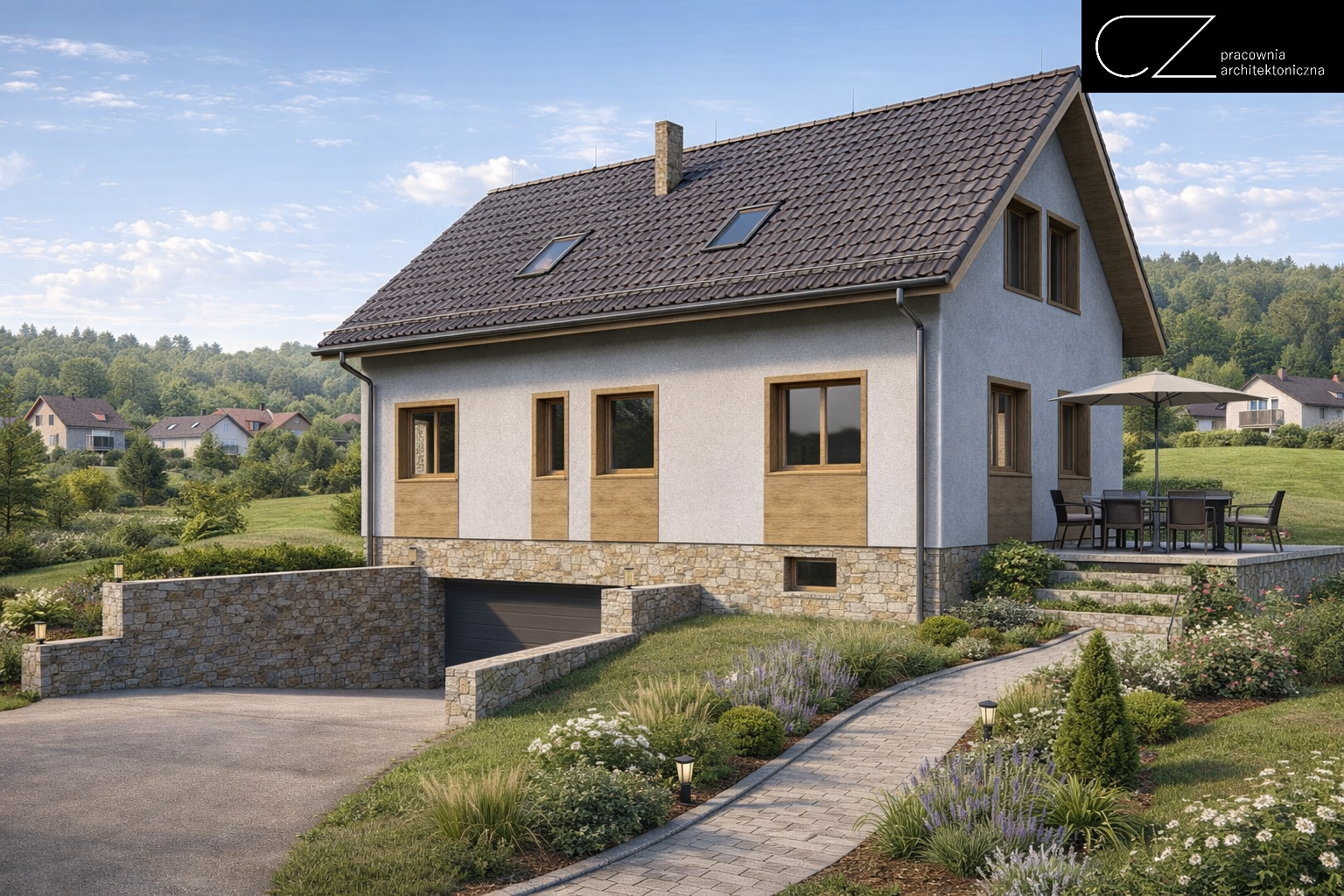 W 2024 roku w Czarnym Borze zaprojektowaliśmy dom jednorodzinny wolnostojący, który w prosty i przemyślany sposób wykorzystuje duże nachylenie działki. Dzięki temu naturalnie wpisaliśmy w teren kondygnację podziemną z garażem i pomieszczeniami technicznymi, a część mieszkalną ukształtowaliśmy tak, by była wygodna, funkcjonalna i dopasowana do codziennego życia domowników. Klasyczna architektura, reprezentacyjne wejście z gankiem, kamienny cokół, jasna elewacja, drewniane akcenty i ciemny dach nadały budynkowi ponadczasowy charakter. Na parterze zaplanowaliśmy komfortową strefę dzienną, na piętrze pokoje mieszkańców oraz gabinet do pracy zdalnej. To projekt pokazujący, że nawet wymagająca działka może stać się atutem dobrze zaprojektowanego domu.