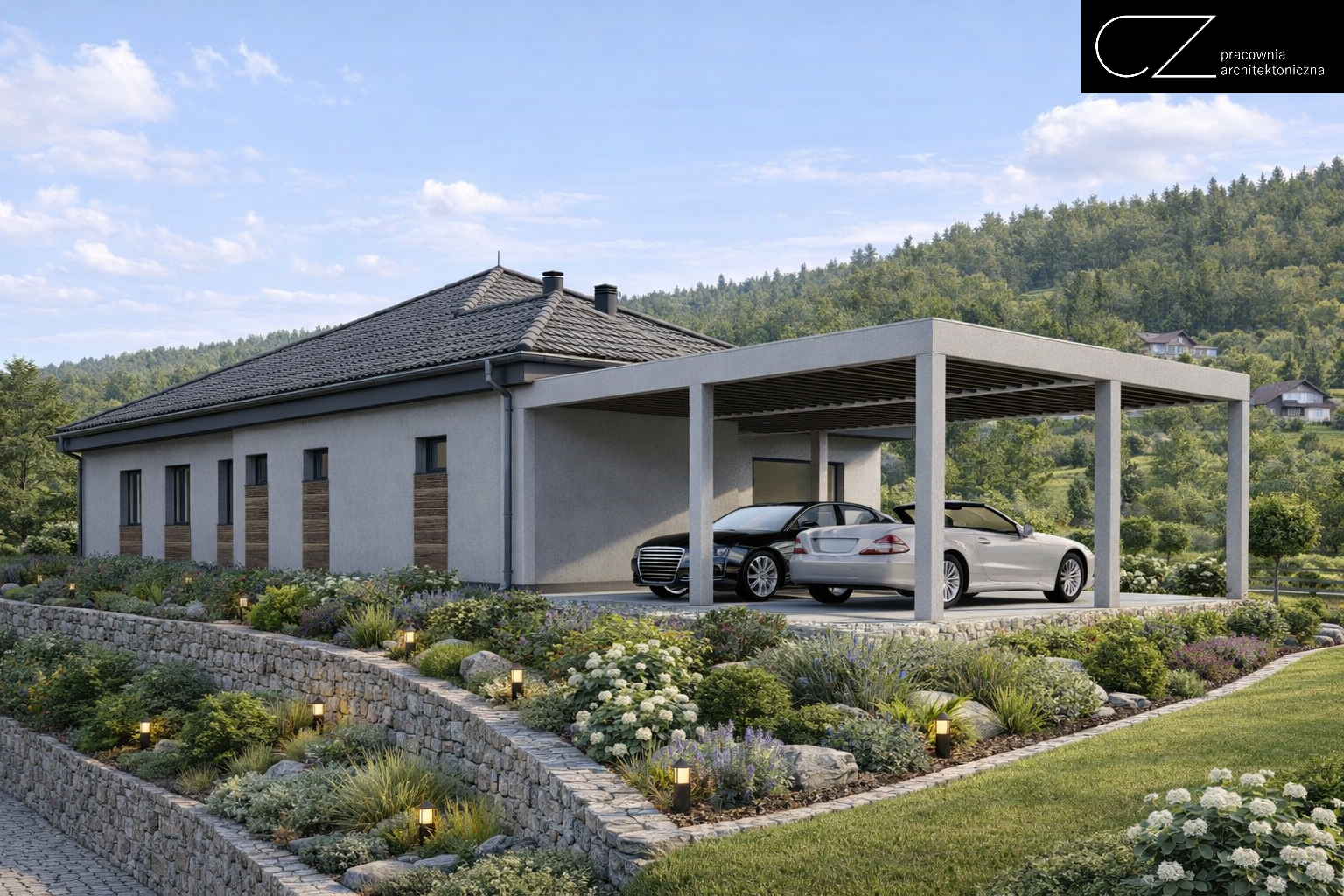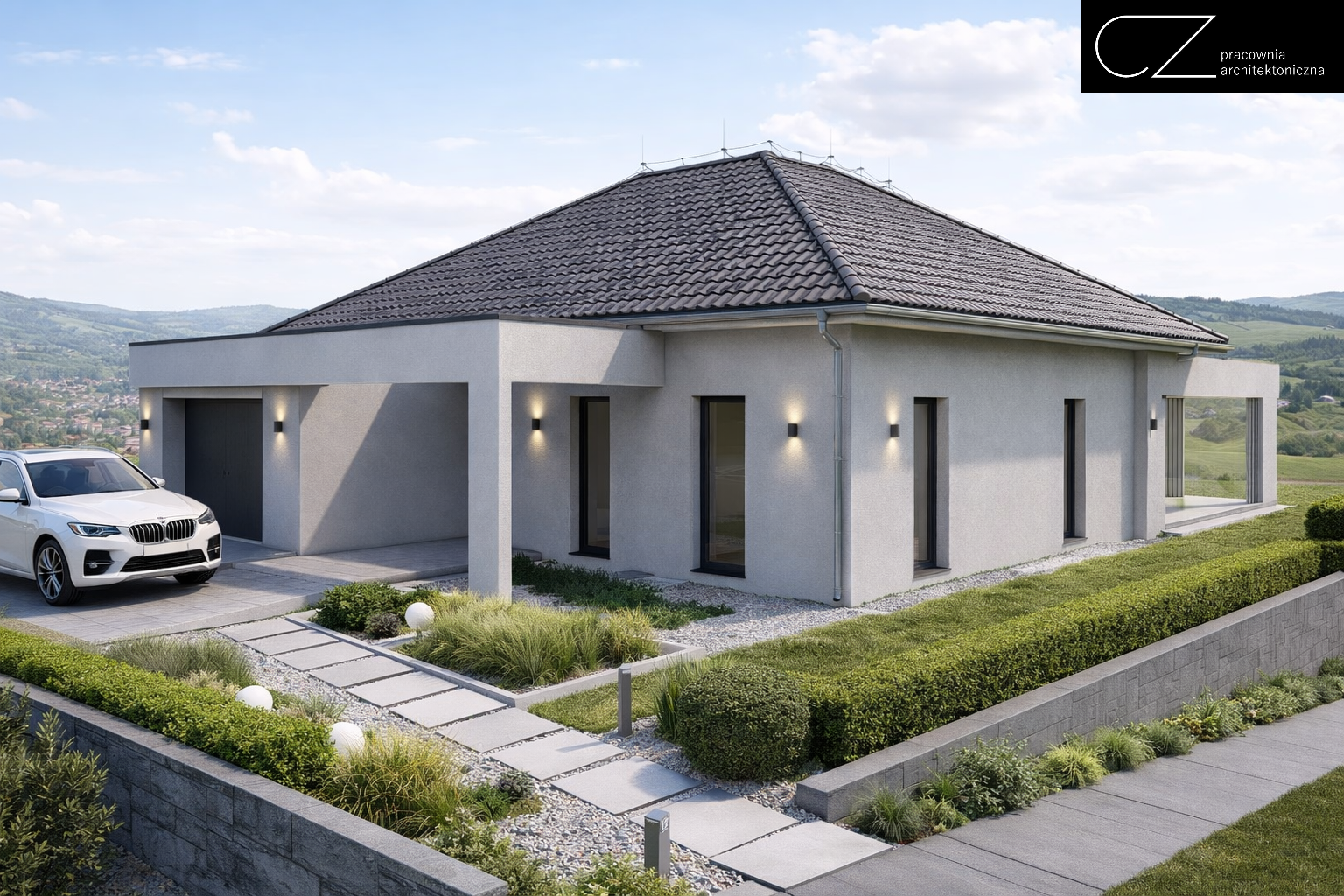 Projekt domu parterowego w Szczawnie-Zdroju z 2024 roku to przykład nowoczesnej architektury podporządkowanej zarówno estetyce, jak i wymagającym warunkom działki. Inwestorom zależało na wyraźnie modernistycznej formie, dlatego bryłę i elewacje oparto wyłącznie na bieli i czerni, uzyskując elegancki, ponadczasowy efekt. Dużym wyzwaniem było silne nachylenie terenu, które wymagało precyzyjnego zaprojektowania murów oporowych i świadomego ukształtowania całego otoczenia budynku, z jednoczesnym odseparowaniem się od bliskiej zabudowy sąsiedniej. Strefę dzienną oraz obszerny taras, częściowo zadaszony, otwarto na najcenniejszy atut tej lokalizacji – widok. Funkcjonalny układ wnętrza łączy garaż, komfortową część dzienną i prywatną strefę mieszkańców, tworząc dom dopracowany w każdym detalu.