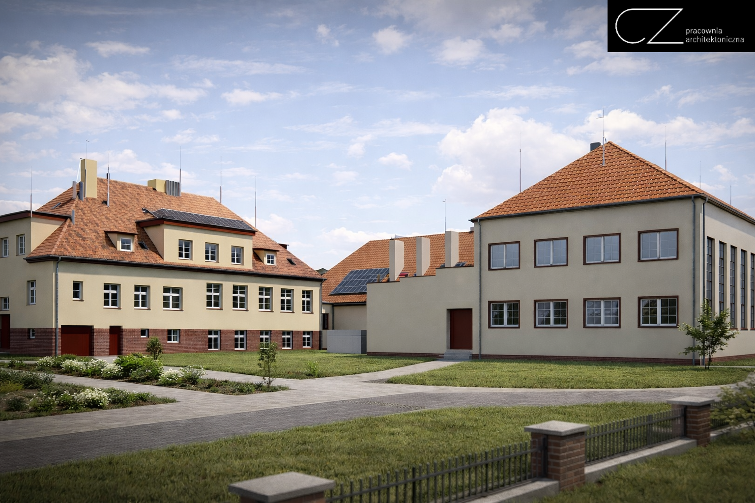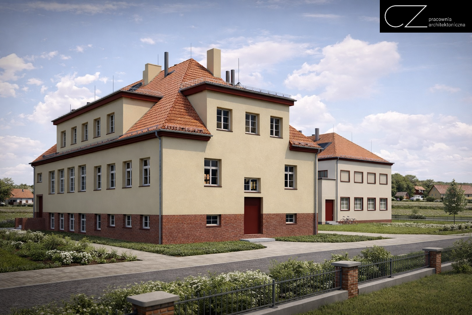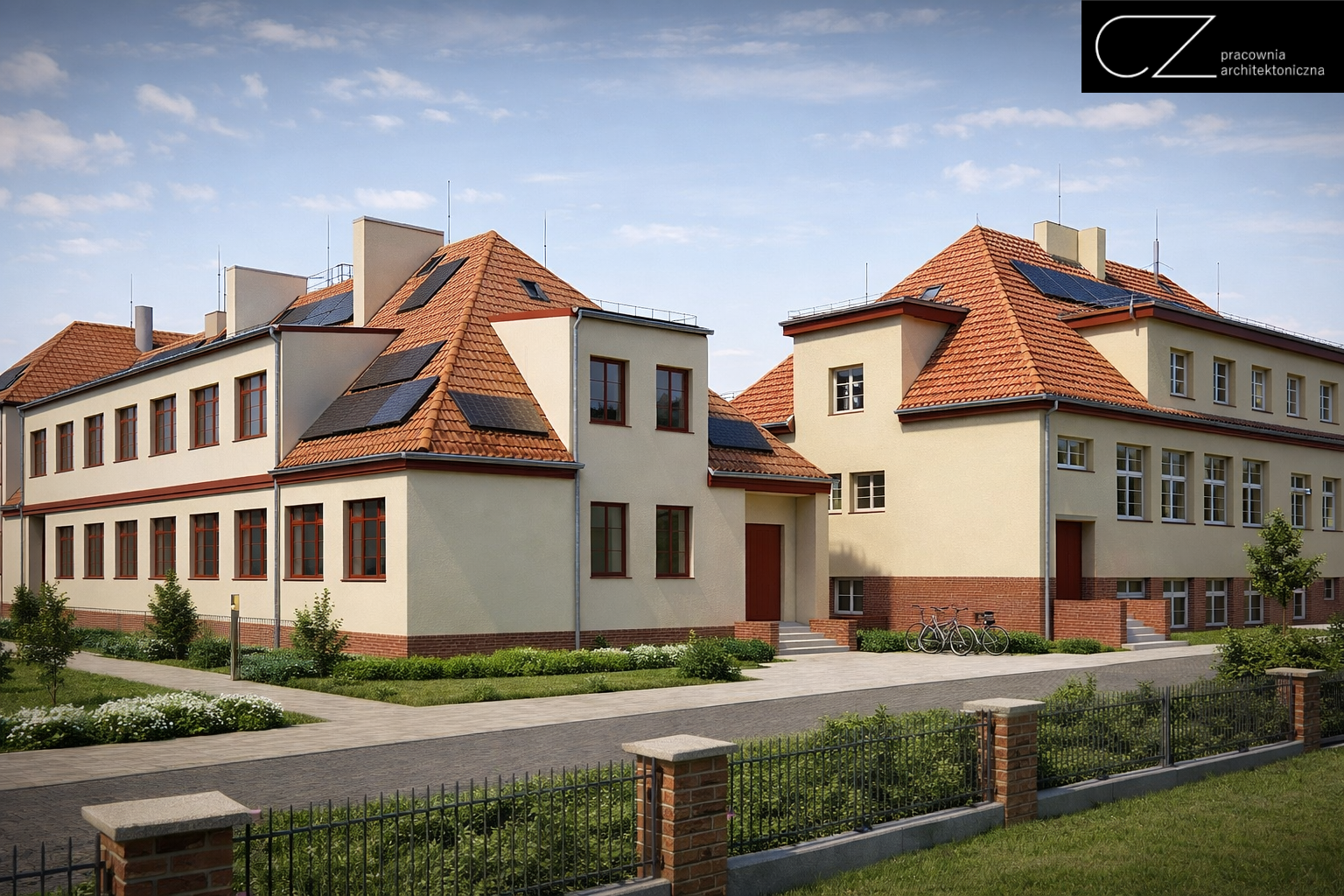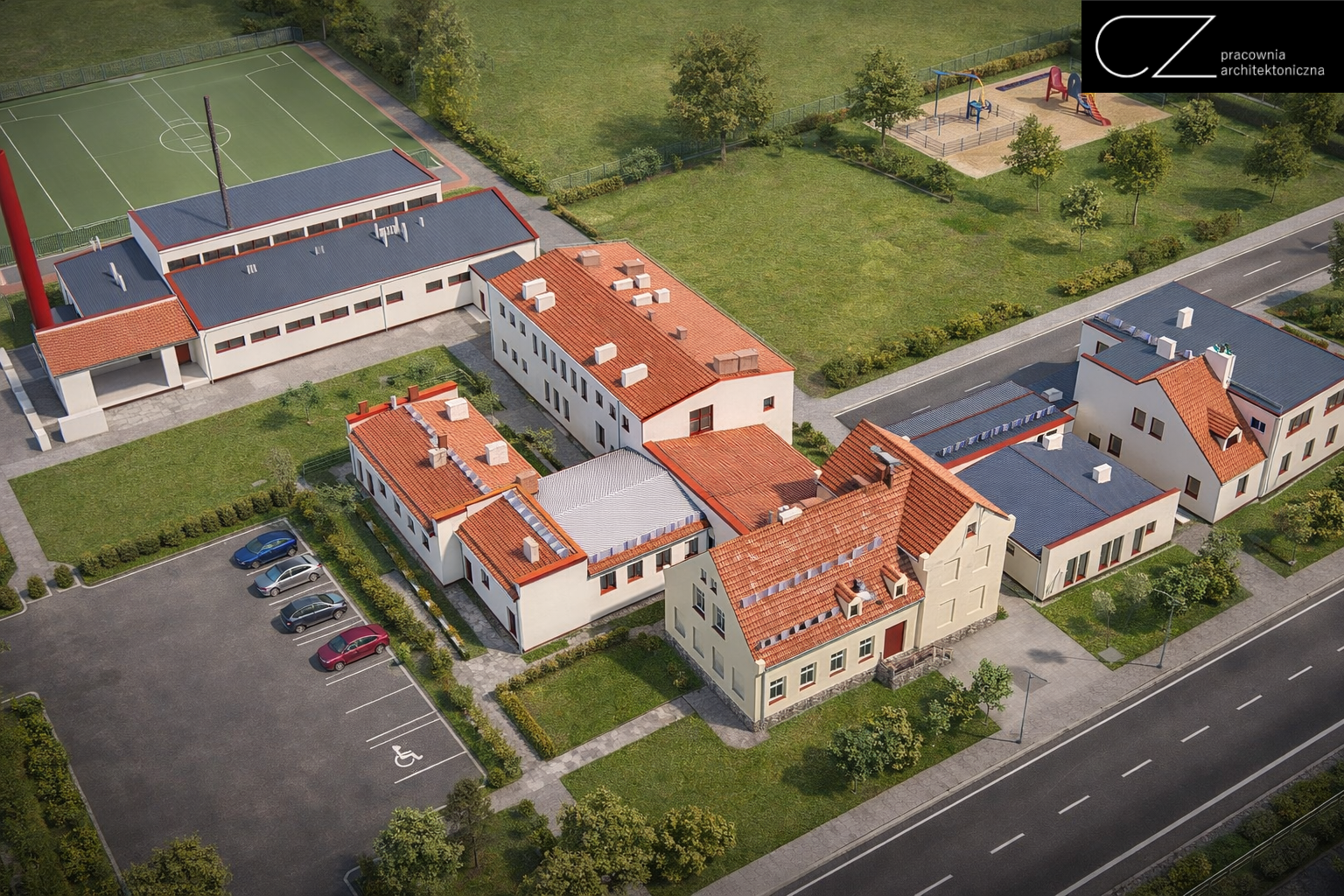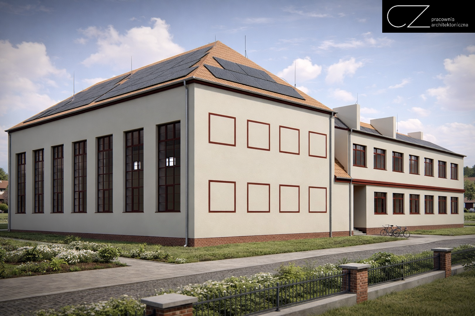Wziąchowo Wielkie to realizacja, która potwierdza nasze kompetencje w prowadzeniu złożonych i wymagających inwestycji modernizacyjnych. W 2024 roku opracowaliśmy kompleksowy projekt modernizacji energetycznej szkoły obejmującej zarówno obiekty zabytkowe, jak i nowsze części dobudowywane na przestrzeni lat, tworzące skomplikowany układ funkcjonalno-przestrzenny. Zakres opracowania objął termomodernizację ścian, dachów i ścian piwnicznych, wymianę stolarki oraz pokryć dachowych, a także wdrożenie nowoczesnych rozwiązań instalacyjnych, w tym fotowoltaiki i pomp ciepła. Całość wymagała sprawnej koordynacji międzybranżowej, uzgodnień z konserwatorem oraz przeprowadzenia pełnego procesu formalnego, co dobrze pokazuje nasze doświadczenie w opracowywaniu dokumentacji dla obiektów o wysokim stopniu złożoności technicznej i formalnej.