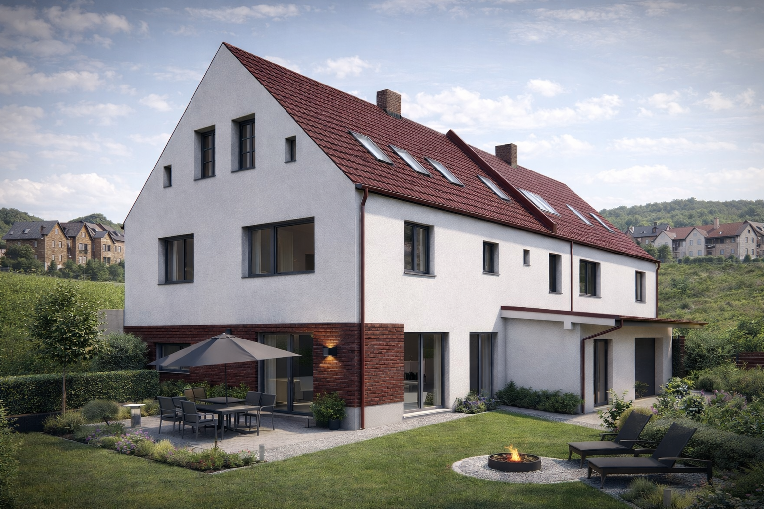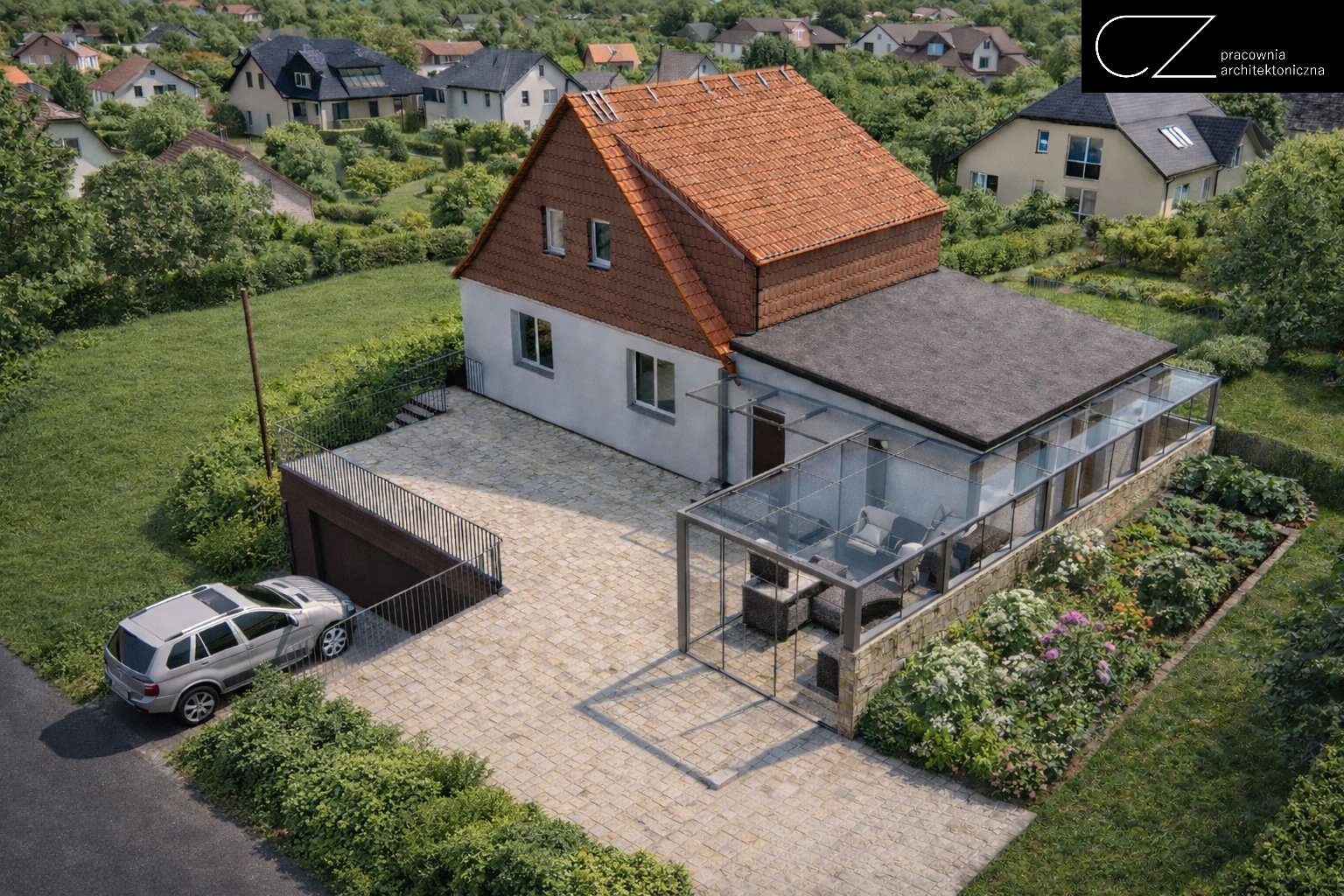 Projekt z 2020 roku w Wałbrzychu obejmował rozbudowę budynku mieszkalnego w zabudowie bliźniaczej o parterową część, która porządkowała i wzmacniała strefę wejściową oraz tarasową. Dobudowę zaprojektowaliśmy tak, aby poprawić funkcjonalność codziennego użytkowania – czytelne wejście, lepsze powiązanie wnętrza z ogrodem i bardziej komfortowa strefa wypoczynkowa – przy jednoczesnym zachowaniu spójności bryły z istniejącym budynkiem. Kluczowe było dopasowanie proporcji, geometrii i detalu architektonicznego do zastanego układu, tak aby rozbudowa wyglądała naturalnie i stanowiła integralną część całości. Efektem jest prosta, elegancka ingerencja, która realnie podnosi standard domu bez nadmiernej ingerencji w istniejącą zabudowę.