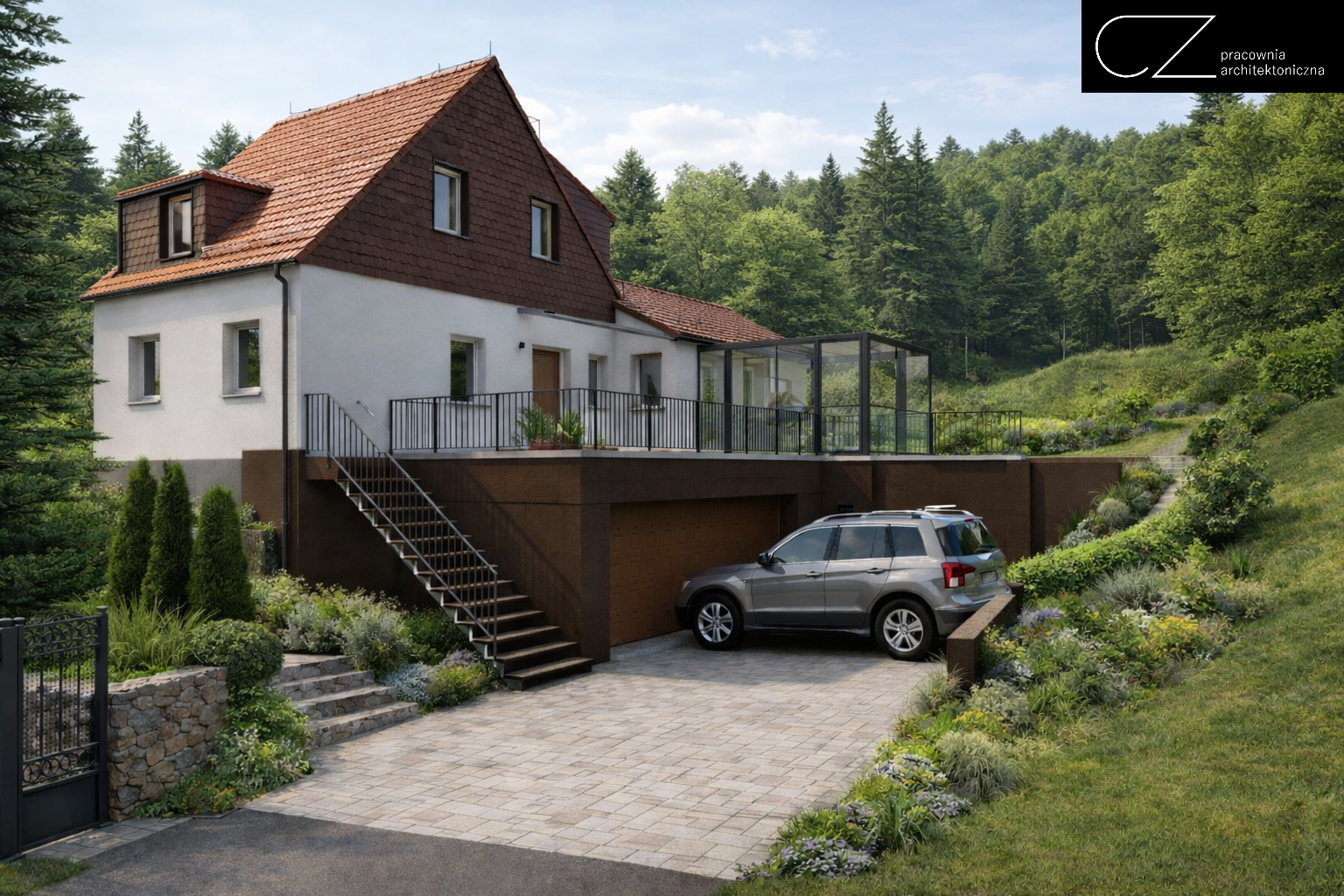 Projekt z 2024 roku w Wałbrzychu pokazuje, jak przemyślona architektura potrafi wykorzystać potencjał nawet bardzo trudnej działki. Na niewielkim, ciasnym i mocno nachylonym terenie, z wąską drogą dojazdową, zaprojektowaliśmy częściowo zagłębiony w gruncie garaż, rozbudowę istniejącego budynku, ogród zimowy, murki oporowe oraz kompleksowe ukształtowanie całego terenu. Dodatkowym atutem inwestycji stał się taras zaprojektowany na dachu garażu, który pozwolił funkcjonalnie powiększyć przestrzeń użytkową. To realizacja, która potwierdza, że potrafimy prowadzić wymagające projekty kompleksowo, świadomie i z dbałością o każdy detal.