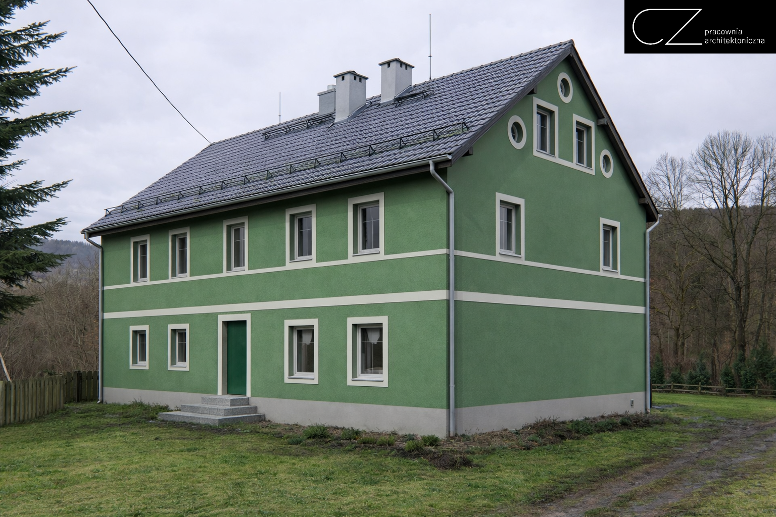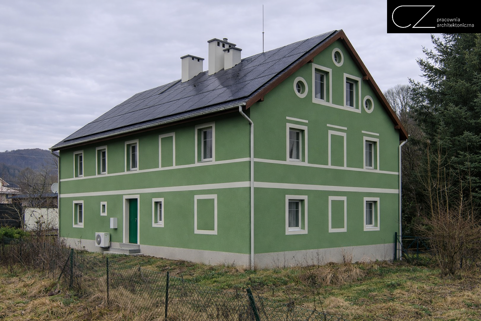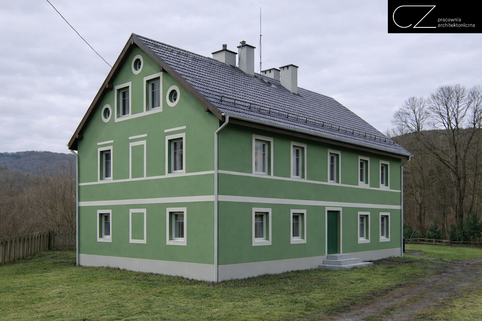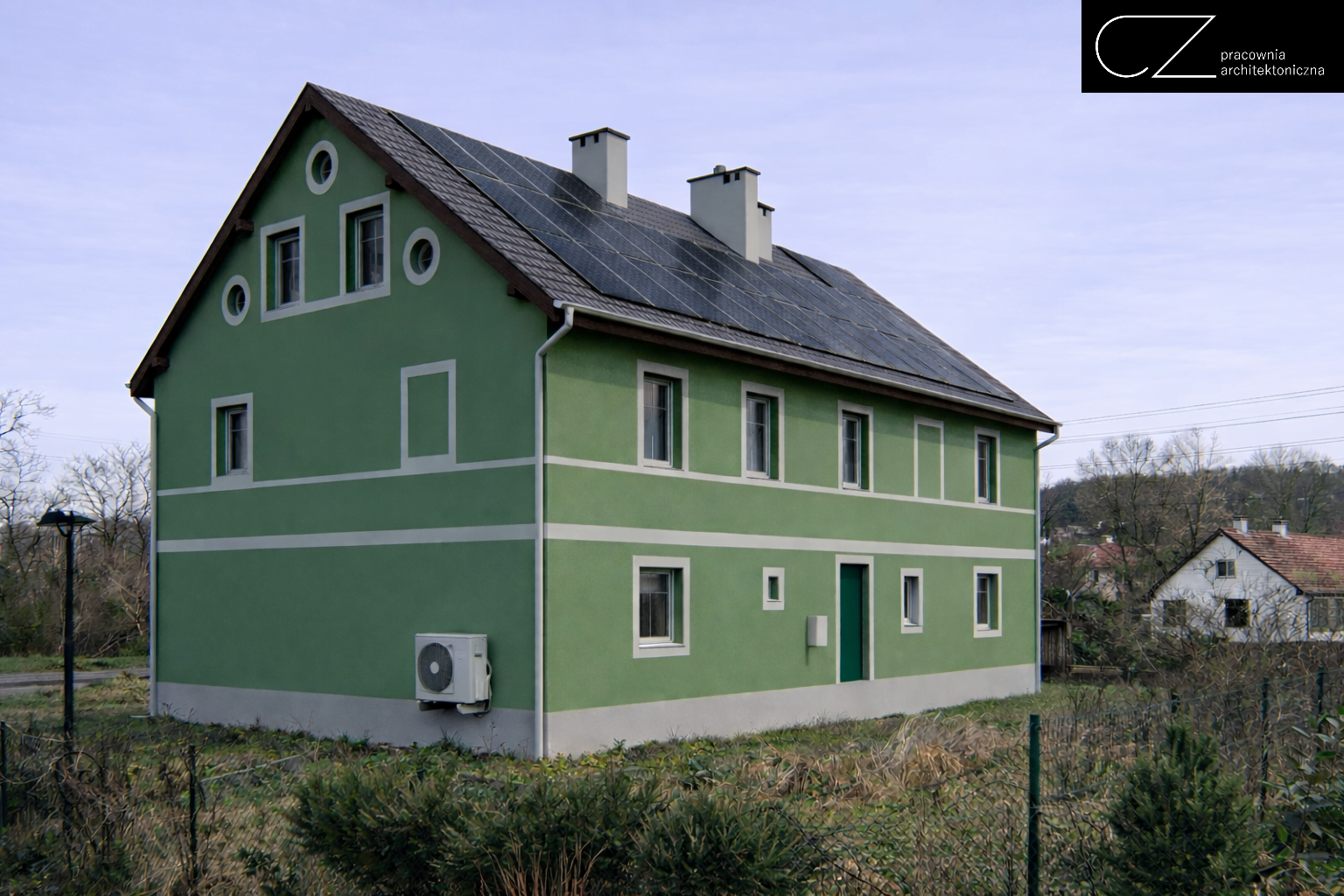 Projekt zrealizowany w 2023 roku w miejscowości Jaszkowa Dolna (gmina Kłodzko) obejmował kompleksową modernizację energetyczną budynku wielorodzinnego wpisanego do rejestru zabytków, co wymagało ścisłej współpracy z konserwatorem na każdym etapie opracowania. Zakres prac objął pełną termomodernizację przegród, wymianę stolarki, modernizację systemów ogrzewania i przygotowania ciepłej wody użytkowej, montaż pompy ciepła oraz instalacji fotowoltaicznej. Kluczowym wyzwaniem było zaprojektowanie nowej więźby dachowej ze względu na niewystarczającą nośność istniejącej konstrukcji, a także uporządkowanie chaotycznych, wieloletnich dobudów i przekształceń obiektu. Efektem jest spójna, technicznie dopracowana i energooszczędna forma architektoniczna, która łączy wymagania konserwatorskie z nowoczesnymi rozwiązaniami, znacząco podnosząc standard użytkowy budynku.
