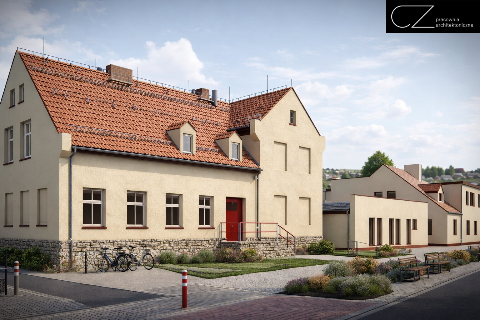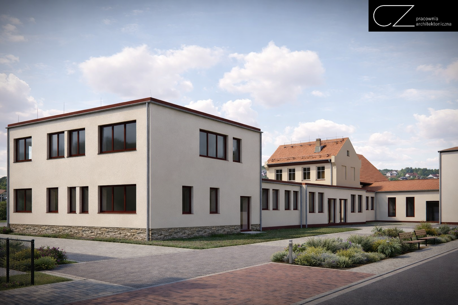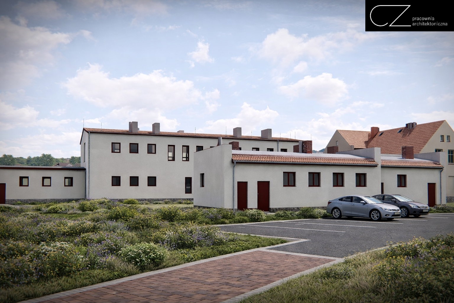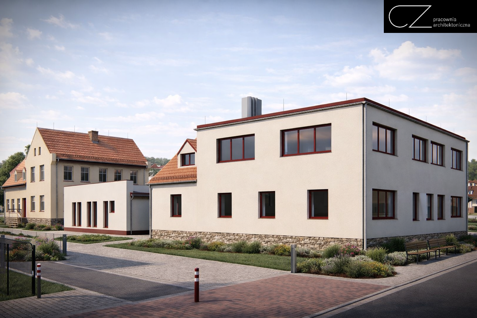 Projekt zrealizowany w 2023 roku w miejscowości Jaszkowa Dolna (gmina Kłodzko) obejmował kompleksową modernizację energetyczną budynku wielorodzinnego wpisanego do rejestru zabytków, co wymagało ścisłej współpracy z konserwatorem na każdym etapie opracowania. Zakres prac objął pełną termomodernizację przegród, wymianę stolarki, modernizację systemów ogrzewania i przygotowania ciepłej wody użytkowej, montaż pompy ciepła oraz instalacji fotowoltaicznej. Kluczowym wyzwaniem było zaprojektowanie nowej więźby dachowej ze względu na niewystarczającą nośność istniejącej konstrukcji, a także uporządkowanie chaotycznych, wieloletnich dobudów i przekształceń obiektu. Efektem jest spójna, technicznie dopracowana i energooszczędna forma architektoniczna, która łączy wymagania konserwatorskie z nowoczesnymi rozwiązaniami, znacząco podnosząc standard użytkowy budynku.