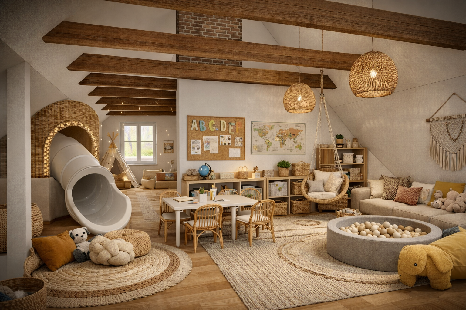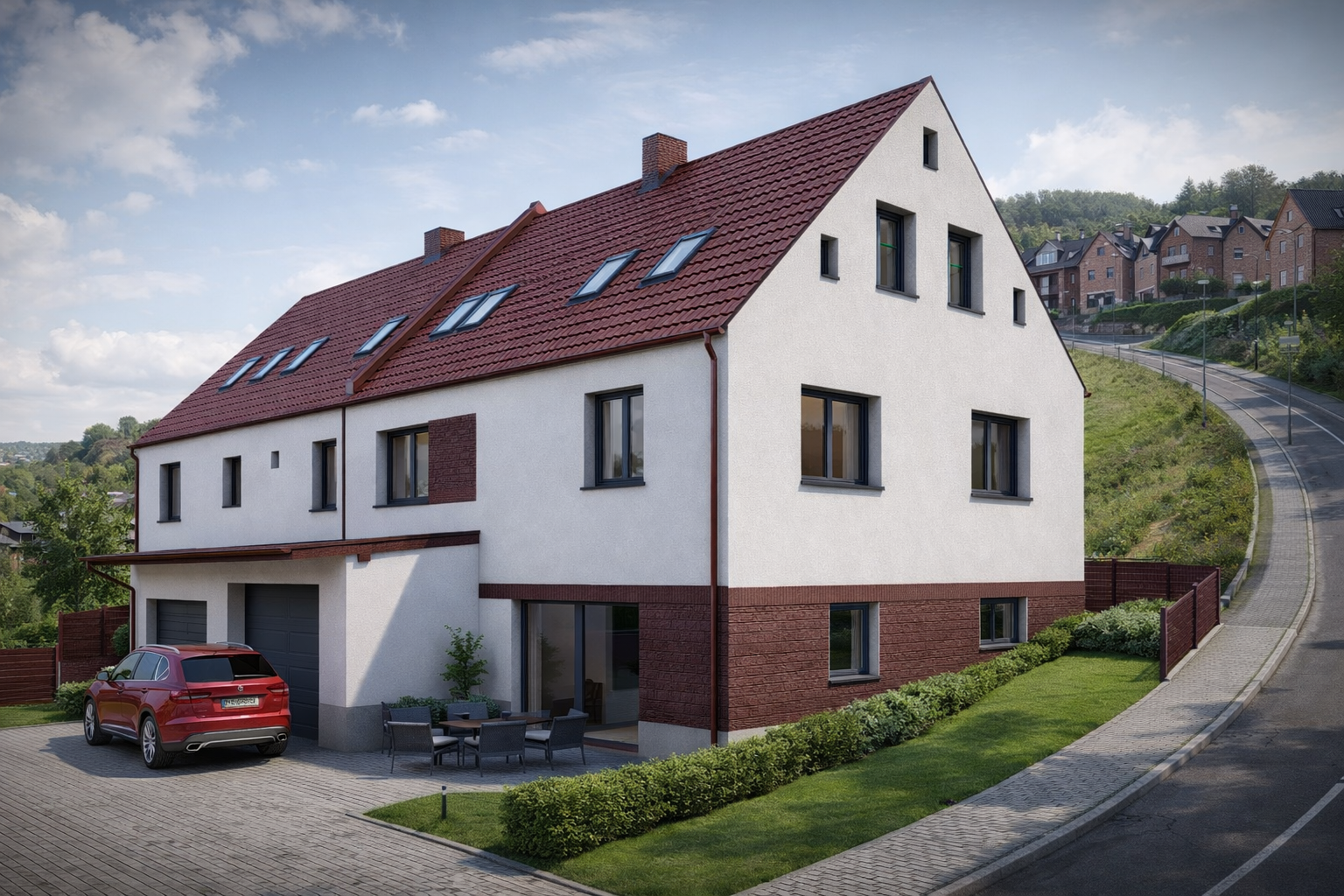 W Wałbrzychu w 2024 roku opracowaliśmy wymagający projekt przebudowy dużego domu jednorodzinnego dla rodziny wielopokoleniowej, łącząc komfort codziennego życia z nowoczesnymi technologiami i bardzo złożonymi uwarunkowaniami formalnymi. Cztery kondygnacje zostały precyzyjnie uporządkowane funkcjonalnie: od technicznej piwnicy, przez rozbudowany parter z nową strefą dzienną, garażami i niezależną częścią dla dziadków, po piętro z pokojami domowników oraz poddasze zamienione w wyjątkową strefę zabawy i nauki dla dzieci ze ślizgawką prowadzącą na niższą kondygnację. Całość uzupełniły zaawansowane rozwiązania, takie jak gruntowa pompa ciepła, gruntowy wymiennik ciepła, rekuperacja oraz skomplikowane hydroizolacje piwnic metodą iniekcji, a dzięki sprawnej koordynacji doprowadziliśmy do końca również trudne uzgodnienia związane z lokalizacją budynku przy samej granicy z drogą miejską.
